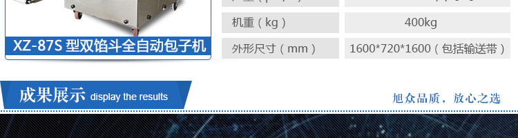 XZ-87S型雙餡斗全自動包子機,可生產各種肉包、肉菜包、菜包、小籠包、湯包、水晶包、圓饅頭、奶黃包、豆沙包、叉燒包、南瓜餅等幾十種包餡制品。適用于賓館、飯店、學校、機關企業食堂、饅頭或包子加工廠、早餐工程店及速凍食品廠等單位。可滿足不同客戶群體。免費提供工藝技術。免費上門培訓指導安裝。
