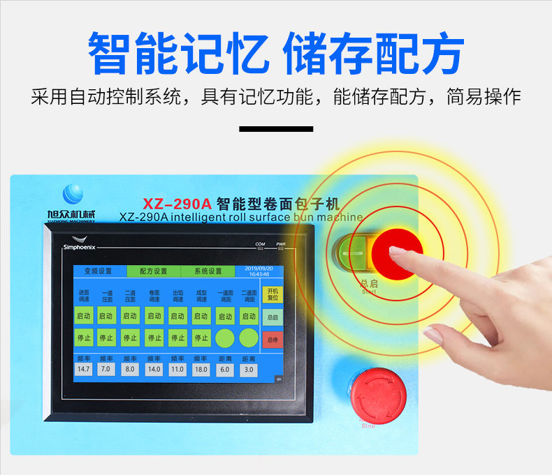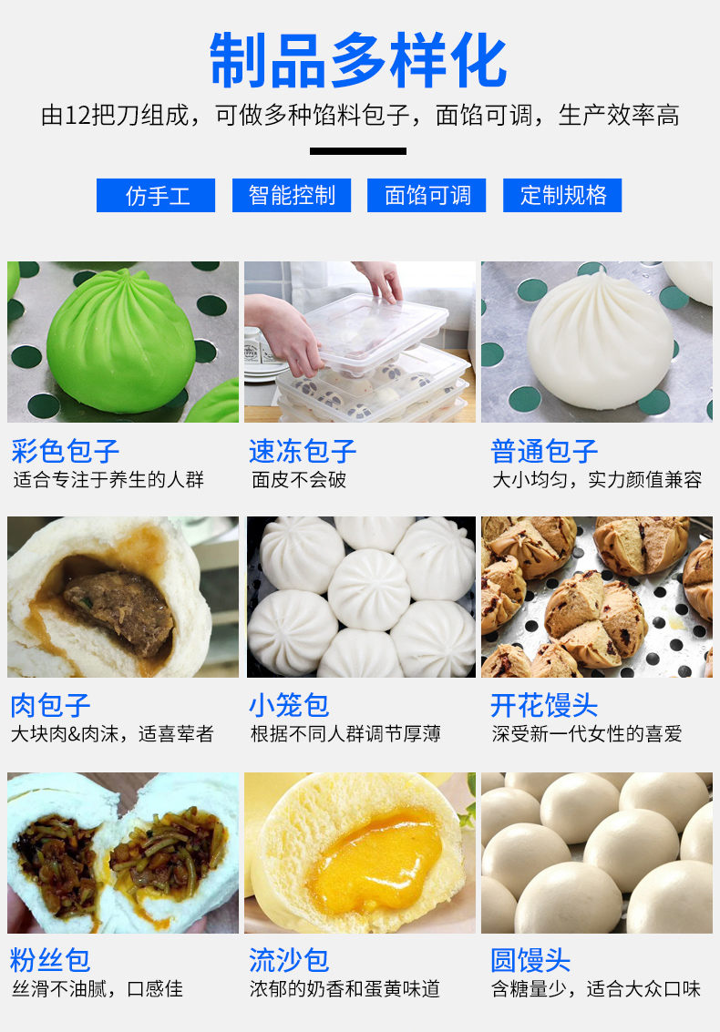 XZ-290A智能型卷面包子機,仿手工智能包子機。操作簡單、精準控制、快速成型、模擬人工。好機器,表里如一,專注品質機器,客戶現場試機。一臺包子機輕松解決手工和面/包餡/人工效率低,用人成本高等一系列問題。
