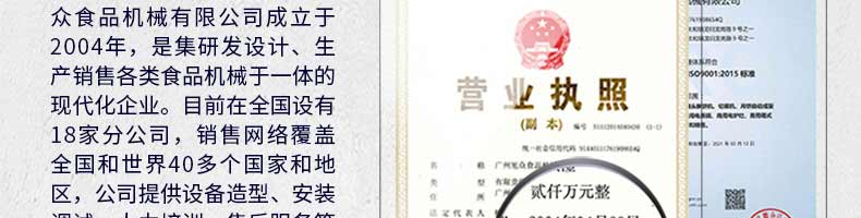 廣州旭眾食品機械有限公司是一家集科研開發,生產設計,營銷服務為一體的現代化生產企業。現代化生產車間,精湛制造技術,所產機械歷經市場重重考驗,不斷贏得海內外客戶的贊譽。