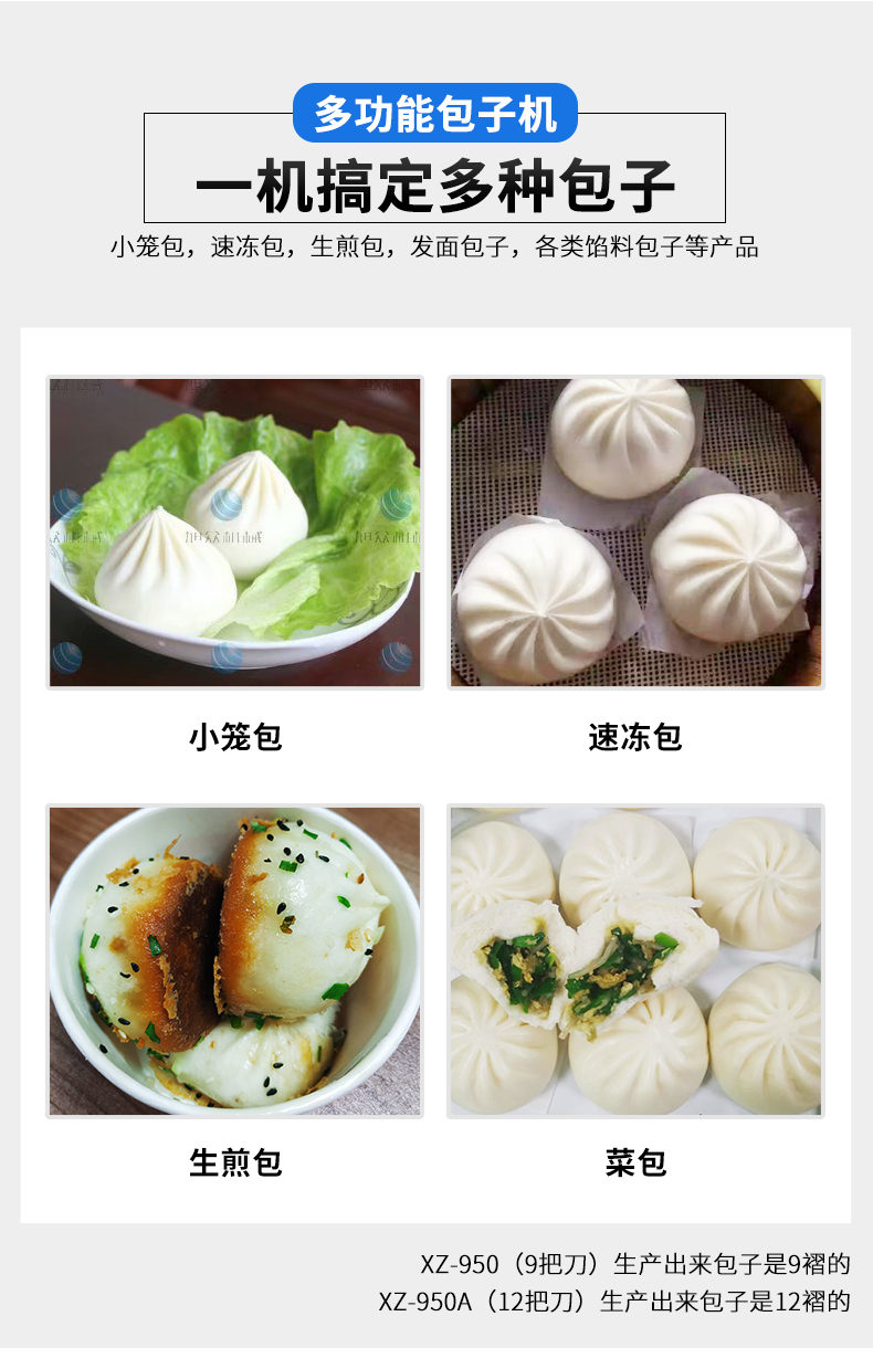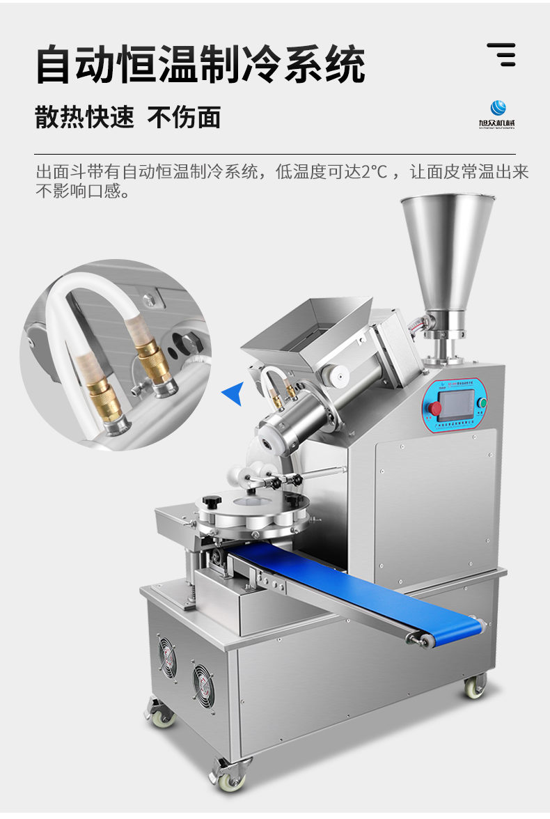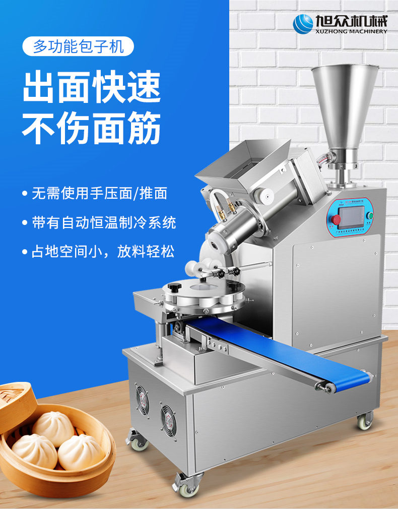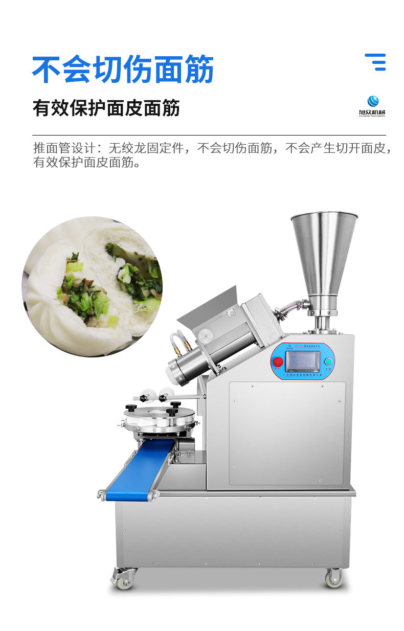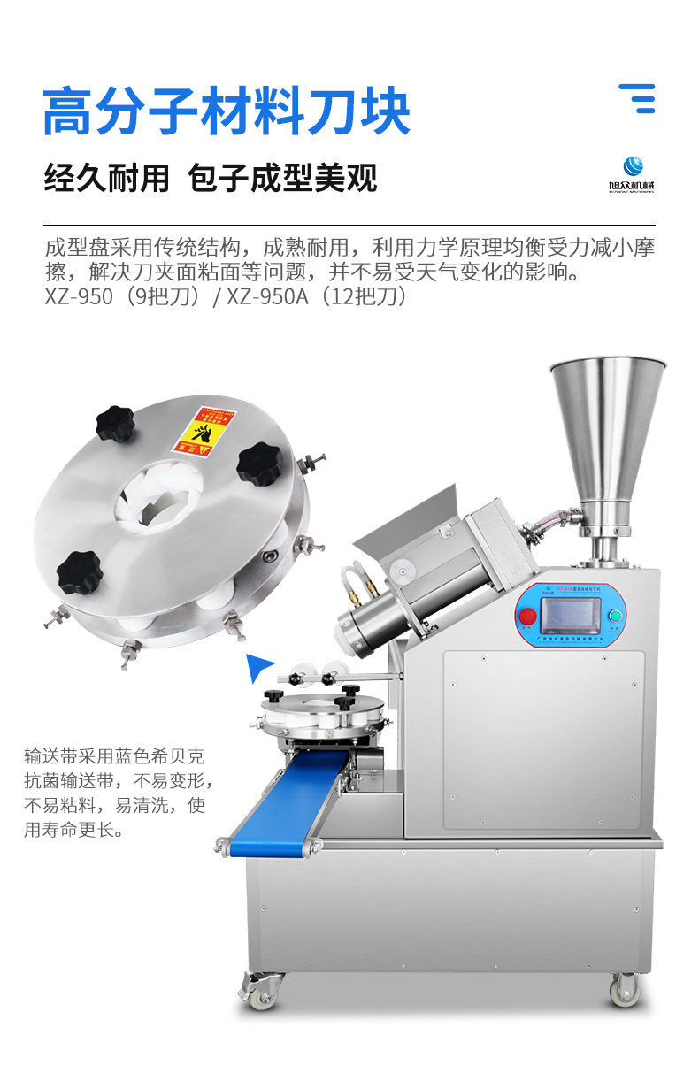 XZ-950型多功能包子機,多功能包子機,出面快速、不傷面筋。無需使用手壓面/推面,帶有自動恒溫制冷系統(tǒng),占地空間小,放料輕松。