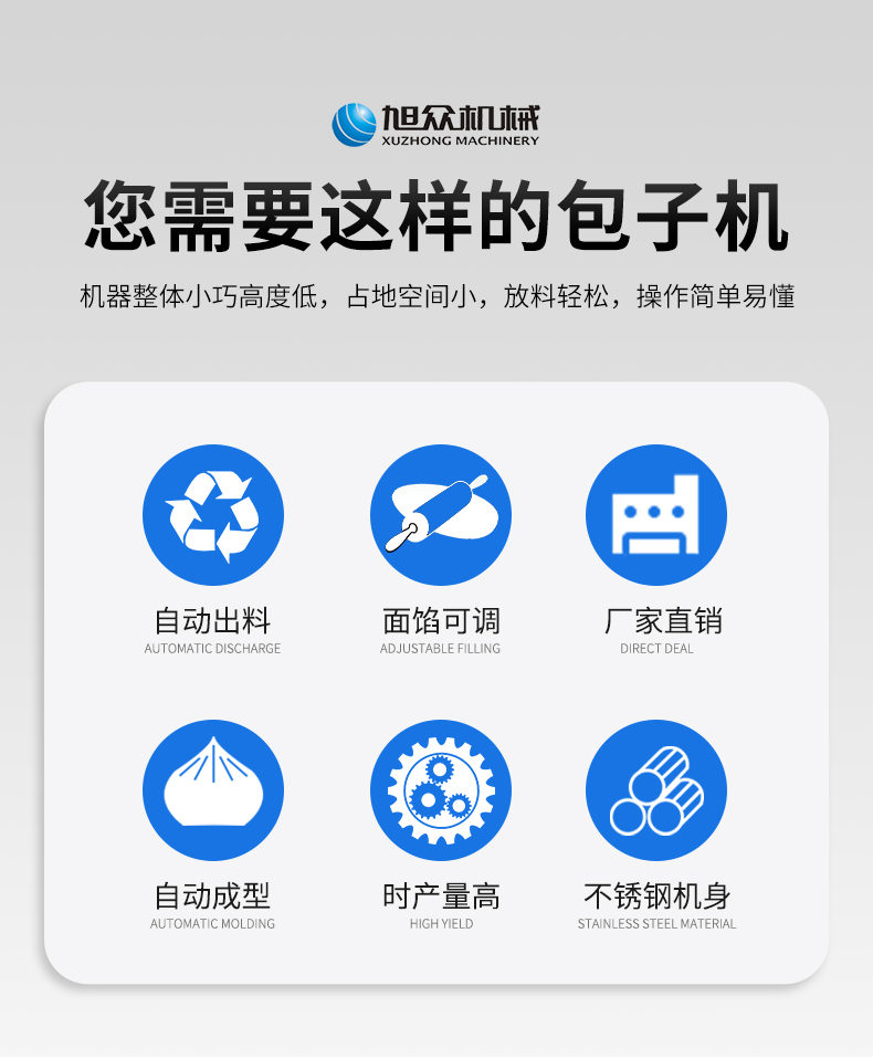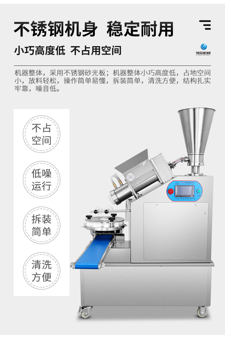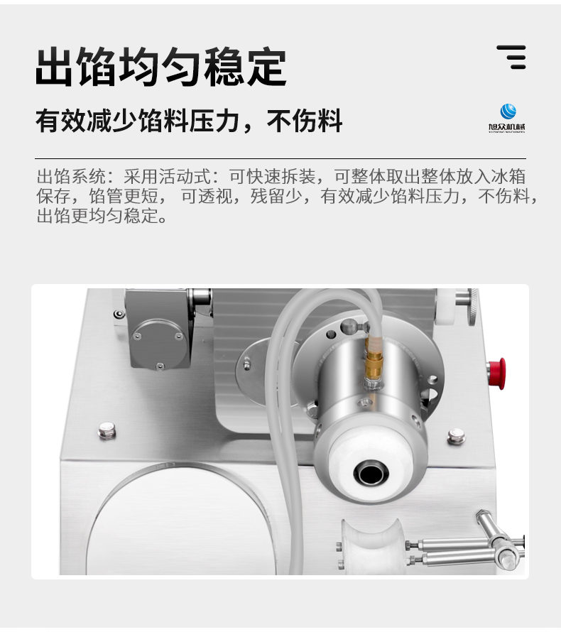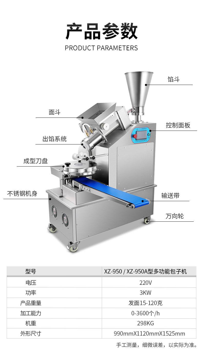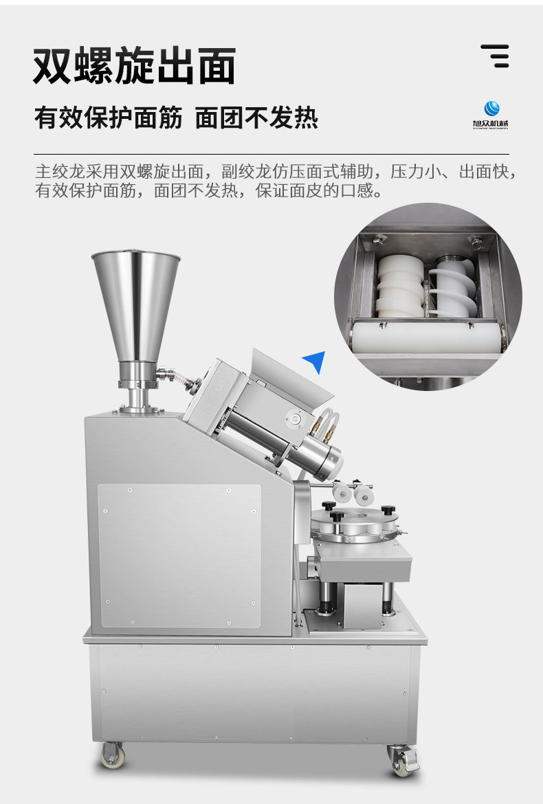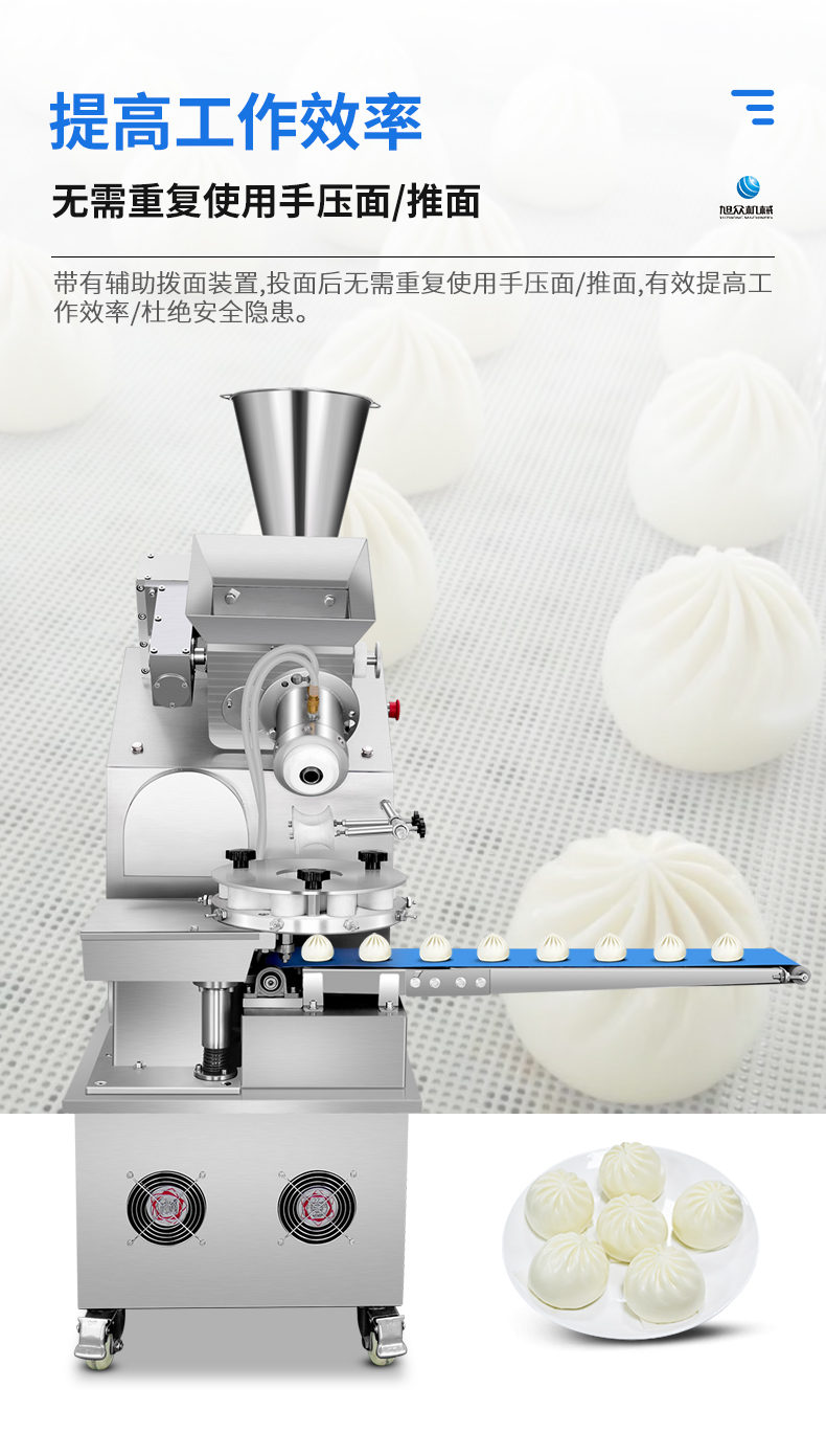 XZ-950型多功能包子機,多功能包子機,出面快速、不傷面筋。無需使用手壓面/推面,帶有自動恒溫制冷系統(tǒng),占地空間小,放料輕松。