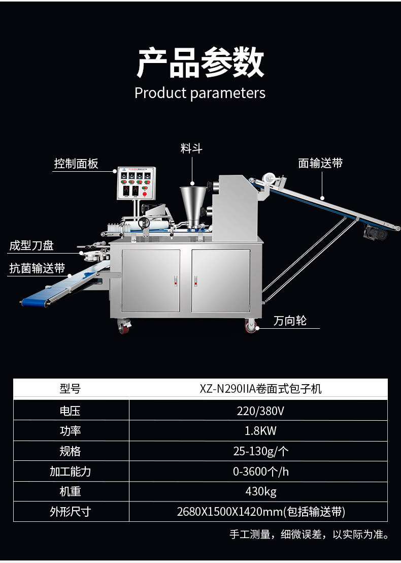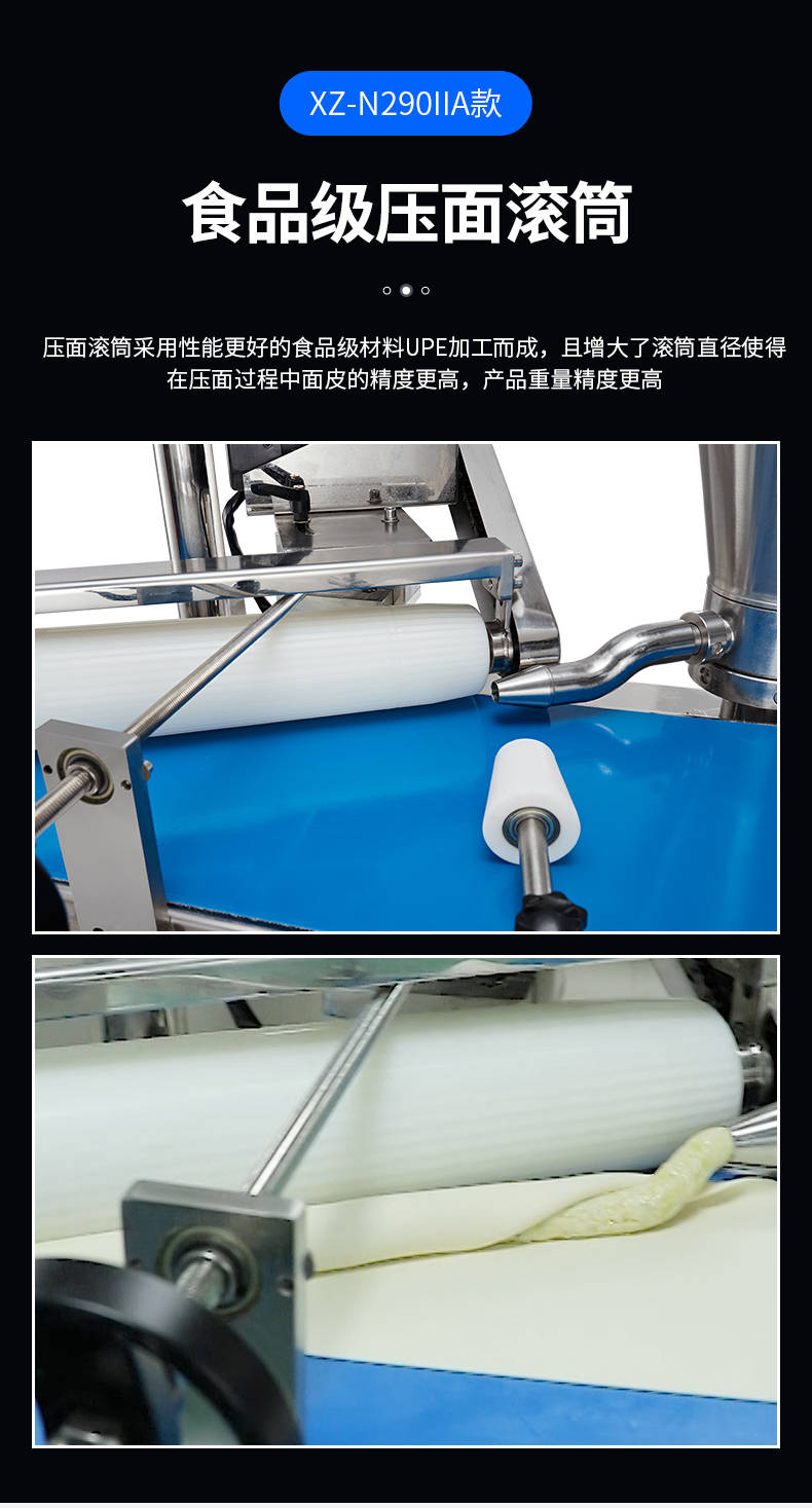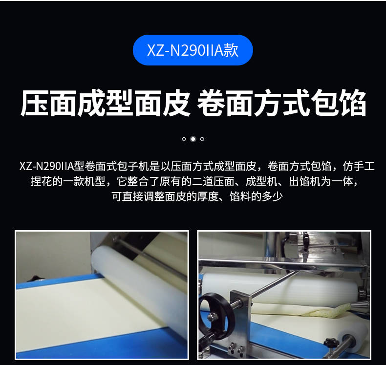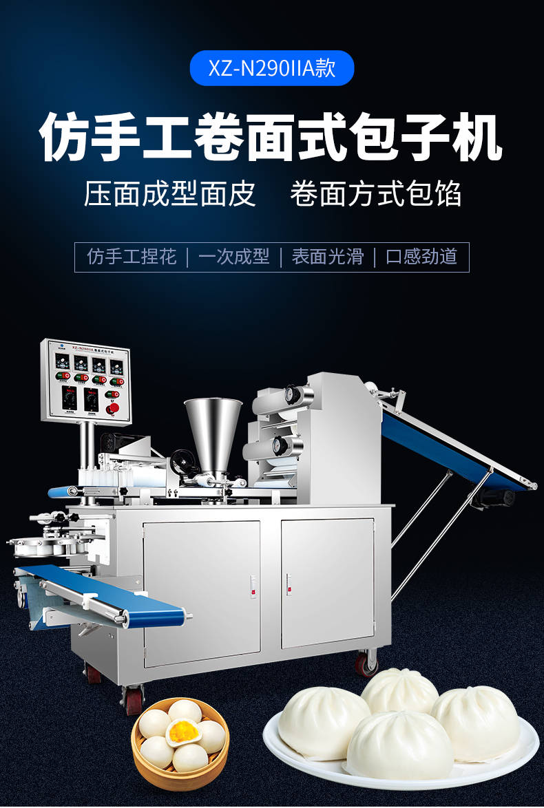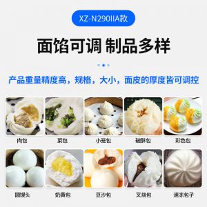 XZ-N290IIA卷面式包子機(jī),壓面成型面皮,卷面方式包餡。仿手工捏花、一次成型、表面光滑、口感勁道。面餡可調(diào)、制品多樣。產(chǎn)品重量精度高,規(guī)格,大小,面皮的厚度皆可調(diào)控。