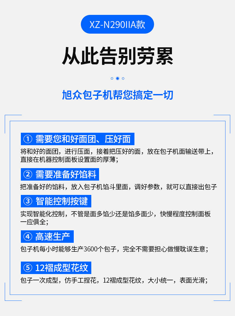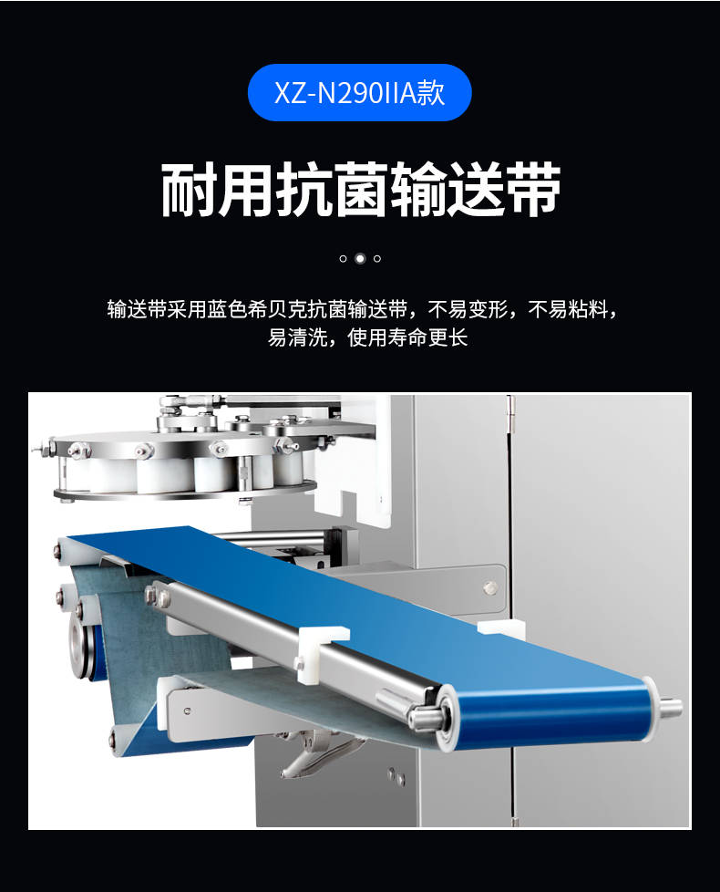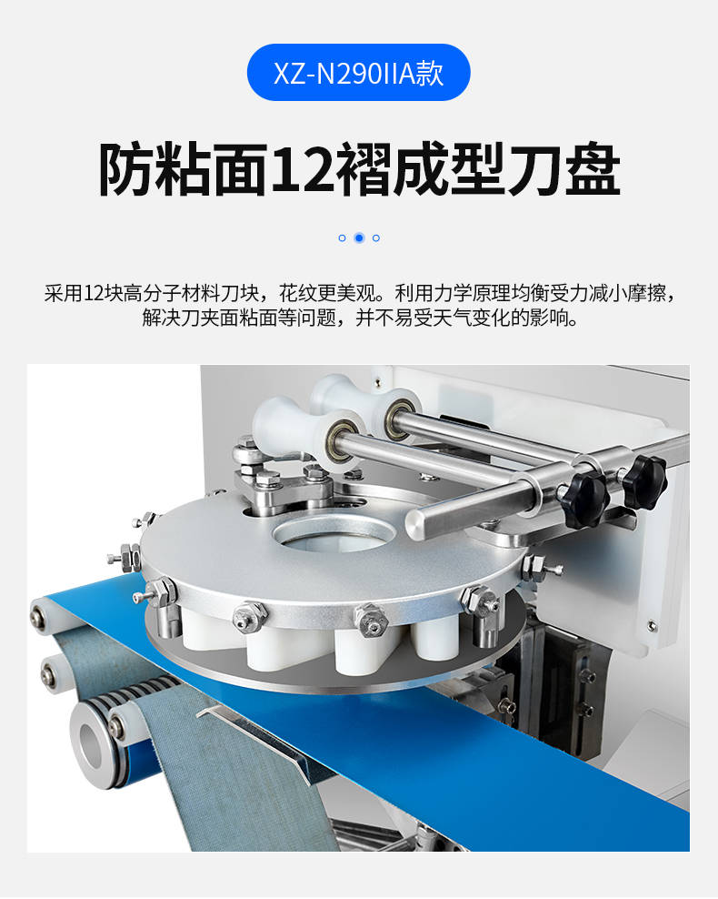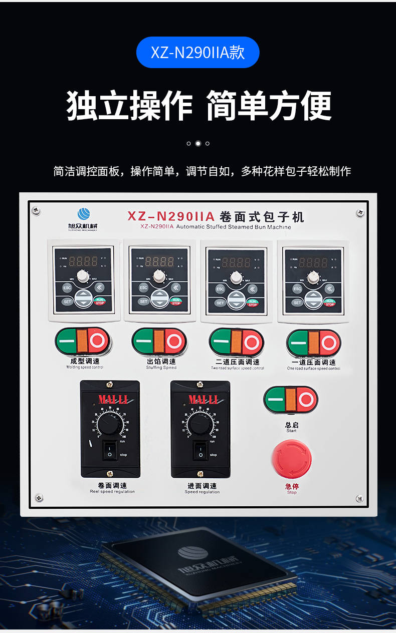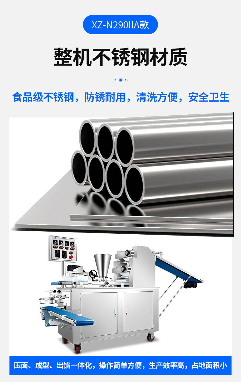 XZ-N290IIA卷面式包子機(jī),壓面成型面皮,卷面方式包餡。仿手工捏花、一次成型、表面光滑、口感勁道。面餡可調(diào)、制品多樣。產(chǎn)品重量精度高,規(guī)格,大小,面皮的厚度皆可調(diào)控。
