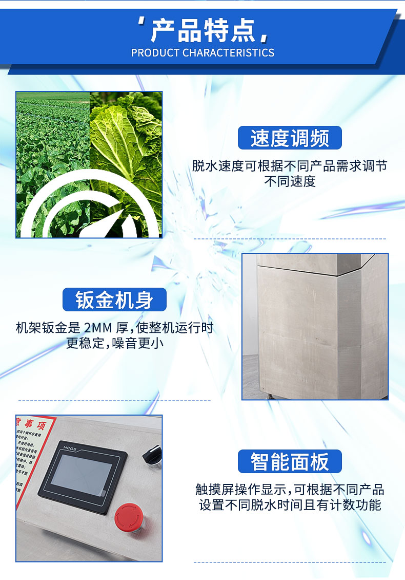 XZ-50型脫水機,蔬菜脫水食品甩干,變頻控制、方便快捷。速度調頻,脫水速度可根據不同產品需求調節不同速度。鈑金機身,機架鈑金是 2MM 厚,使整機運行時更穩定,噪音更小。