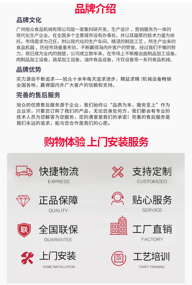 廣州旭眾食品機械有限公司是一家集科研開發,生產設計,營銷服務為一體的現代化生產企業。現代化生產車間,精湛制造技術,所產機械歷經市場重重考驗,不斷贏得海內外客戶的贊譽。