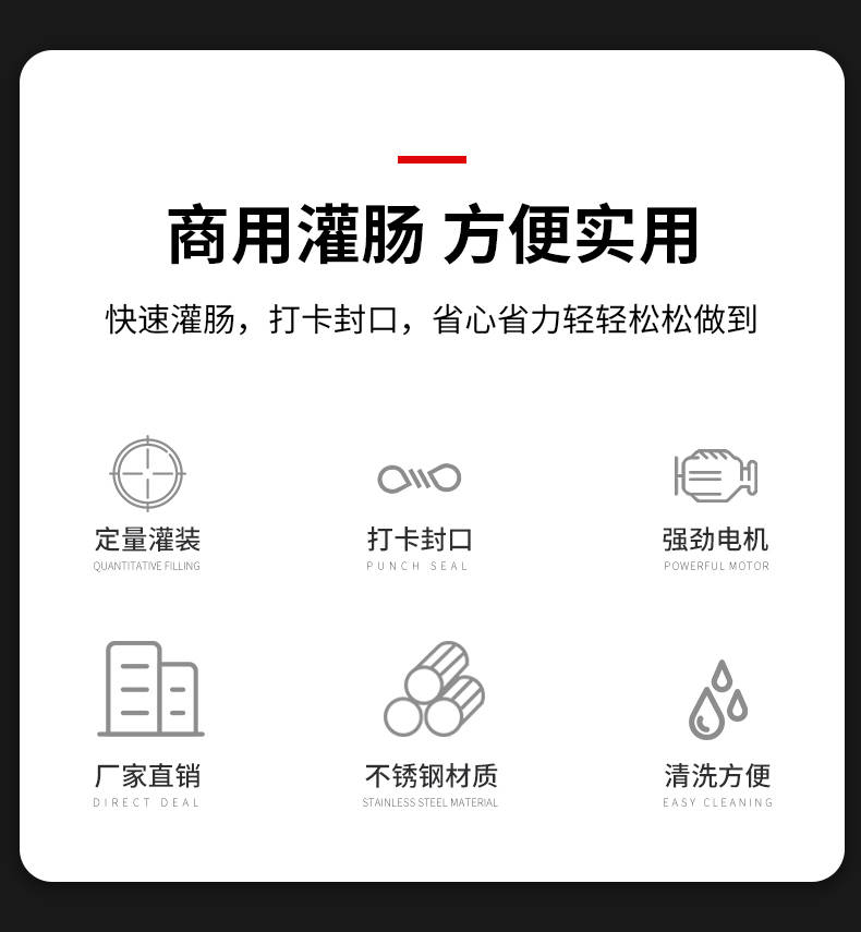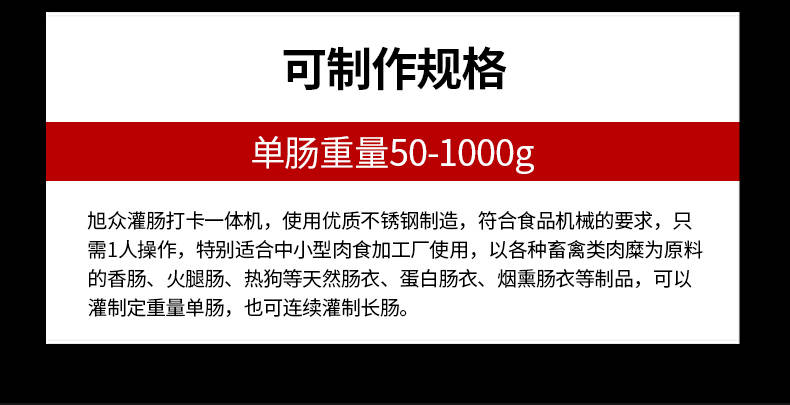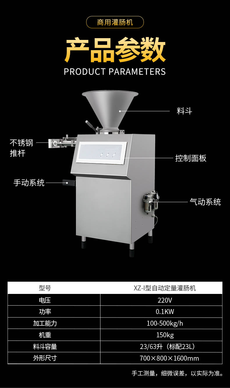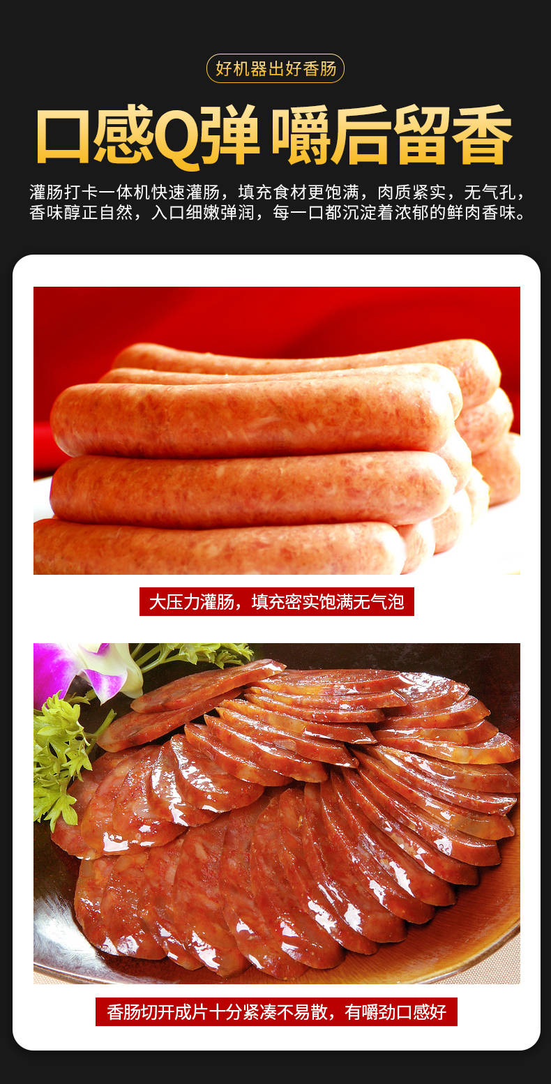 XZ-I型自動(dòng)定量灌腸機(jī),使用優(yōu)質(zhì)不銹鋼制造,符合食品機(jī)械的要求,只需1人操作,特別適合中小型肉食加工廠使用,以各種畜禽類肉糜為原料的香腸、火腿腸、熱狗等天然腸衣、蛋白腸衣、煙熏腸衣等制品,可以灌制定重量單腸,也可連續(xù)灌制長(zhǎng)腸。
