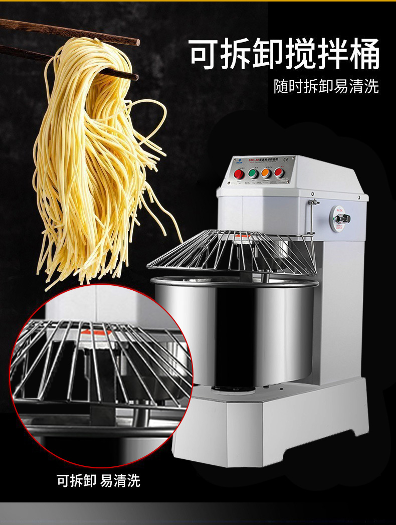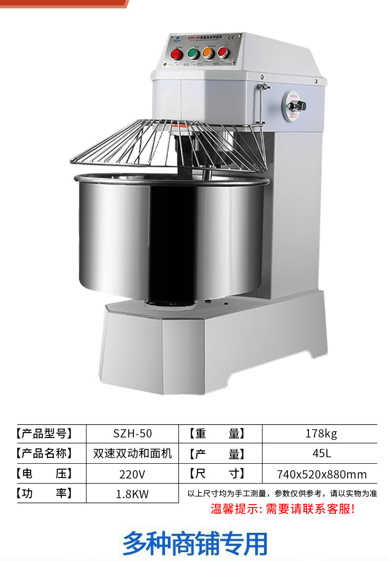 SZH-50型雙速雙動和面機,本機適合攪拌各種面包、包子、饅頭、湯圓、披薩餅面團,專業設計避免面團過分升溫并確保面團含氧量。過載、缺相保護裝置,防護罩安全連動裝置。
