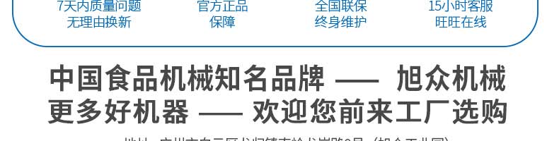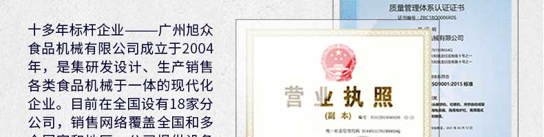 廣州旭眾食品機械有限公司是一家集科研開發(fā),生產(chǎn)設計,營銷服務為一體的現(xiàn)代化生產(chǎn)企業(yè)。現(xiàn)代化生產(chǎn)車間,精湛制造技術,所產(chǎn)機械歷經(jīng)市場重重考驗,不斷贏得海內(nèi)外客戶的贊譽。