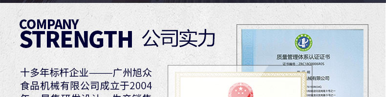 廣州旭眾食品機(jī)械有限公司是一家集科研開發(fā),生產(chǎn)設(shè)計,營銷服務(wù)為一體的現(xiàn)代化生產(chǎn)企業(yè)。現(xiàn)代化生產(chǎn)車間,精湛制造技術(shù),所產(chǎn)機(jī)械歷經(jīng)市場重重考驗(yàn),不斷贏得海內(nèi)外客戶的贊譽(yù)。