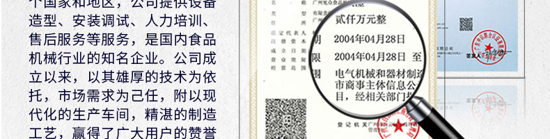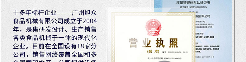 廣州旭眾食品機械有限公司是一家集科研開發,生產設計,營銷服務為一體的現代化生產企業。現代化生產車間,精湛制造技術,所產機械歷經市場重重考驗,不斷贏得海內外客戶的贊譽。