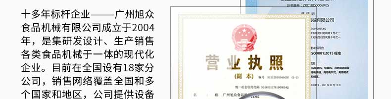 廣州旭眾食品機械有限公司是一家集科研開發,生產設計,營銷服務為一體的現代化生產企業。現代化生產車間,精湛制造技術,所產機械歷經市場重重考驗,不斷贏得海內外客戶的贊譽。