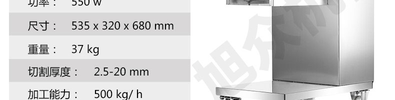 XZ-QE切肉機(jī),是一款可方便移動(dòng)的肉類加工設(shè)備,配置單層刀具一次性切肉片,二次切肉絲,再切成粒。底座設(shè)置有滑輪,移動(dòng)靈活,輕松便捷;刀具采取外置懸臂式設(shè)計(jì),拆洗方便,衛(wèi)生更有保障;配置多種刀具,可加工不同厚度的肉片,實(shí)現(xiàn)一機(jī)多用;機(jī)內(nèi)裝有安全保護(hù)開頭,刀具外露時(shí),機(jī)器自鎖不能啟動(dòng),以保安全;刀片用特殊不銹鋼材料制造,經(jīng)久耐用;卸下的刀具,不用清洗直接放置在6攝氏度以下的冰箱里,刀具余肉不發(fā)臭。