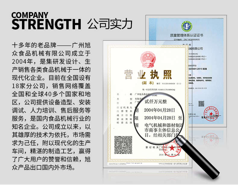 廣州旭眾食品機(jī)械有限公司是一家集科研開發(fā),生產(chǎn)設(shè)計(jì),營銷服務(wù)為一體的現(xiàn)代化生產(chǎn)企業(yè)。現(xiàn)代化生產(chǎn)車間,精湛制造技術(shù),所產(chǎn)機(jī)械歷經(jīng)市場重重考驗(yàn),不斷贏得海內(nèi)外客戶的贊譽(yù)。