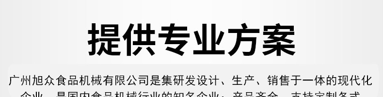 廣州旭眾食品機械有限公司是一家集科研開發,生產設計,營銷服務為一體的現代化生產企業?,F代化生產車間,精湛制造技術,所產機械歷經市場重重考驗,不斷贏得海內外客戶的贊譽。
