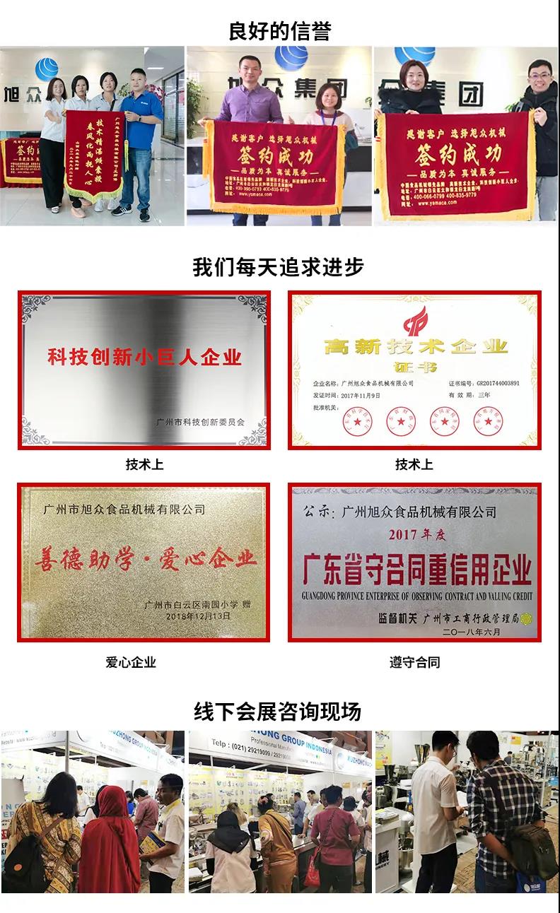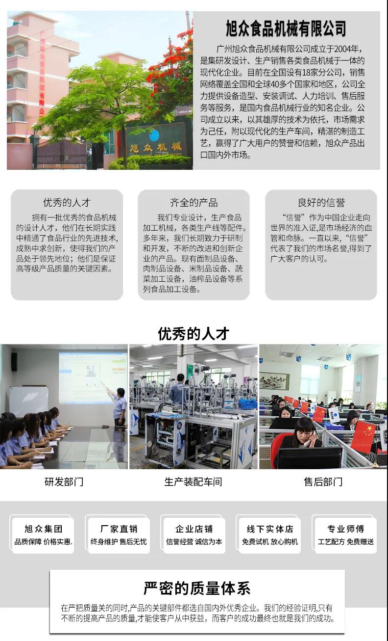 廣州旭眾食品機(jī)械有限公司是一家集科研開發(fā),生產(chǎn)設(shè)計(jì),營銷服務(wù)為一體的現(xiàn)代化生產(chǎn)企業(yè)。現(xiàn)代化生產(chǎn)車間,精湛制造技術(shù),所產(chǎn)機(jī)械歷經(jīng)市場重重考驗(yàn),不斷贏得海內(nèi)外客戶的贊譽(yù)。